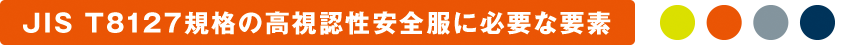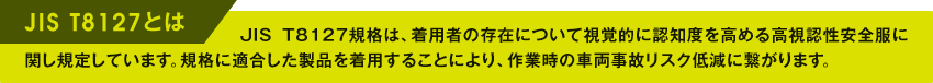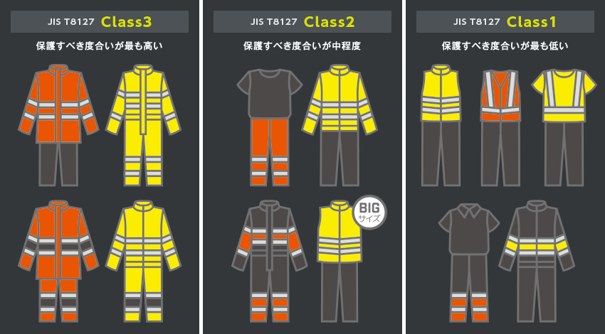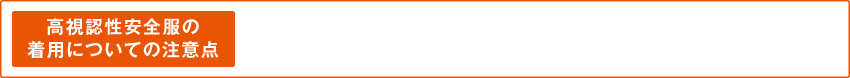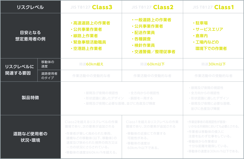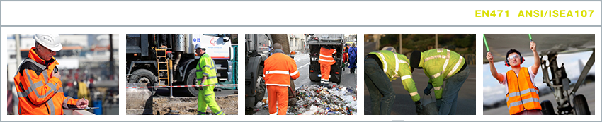 ヨーロッパではEN471(High visibility warning clothing)、アメリカ合衆国ではANSI107(High visibility safety appareland head wear)などの高視認性安全作業服(衣服)が、作業環境に応じて規格化されていて、企業がその作業着を選ぶ際の基準が明確化されています。日本国内でも2015年10月に高視認性安全服の“JIS T8127”が制定されました。