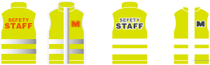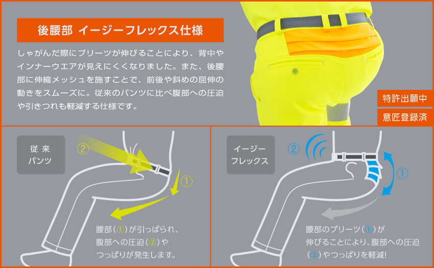 製品には、蛍光素材の目に見える範囲の使用面積・再帰性反射素材の目に見える範囲の使用面積・前身頃と後身頃の面積差は50%±10%以内・再帰性反射素材の角度は20°以内・前立てによる再帰性反射素材の断裂は50㎜以内など、その他にも仕様の要求事項があります。上下の組み合わせによる面積のクラス算出は、JIS T8127より適応されました。